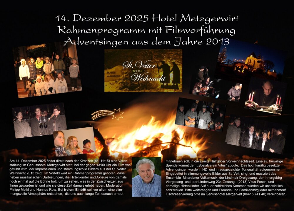 Um 13.00 Uhr wird der in HD digitalisierte Film St. Veiter Weihnacht aus dem Jahr 2013 gezeigt. Die Aufnahmen verbinden eindrucksvolle Bilder, liebevolle Inszenierungen und musikalische Beiträge, die das traditionelle Adventsingen jener Zeit wieder lebendig werden lassen.